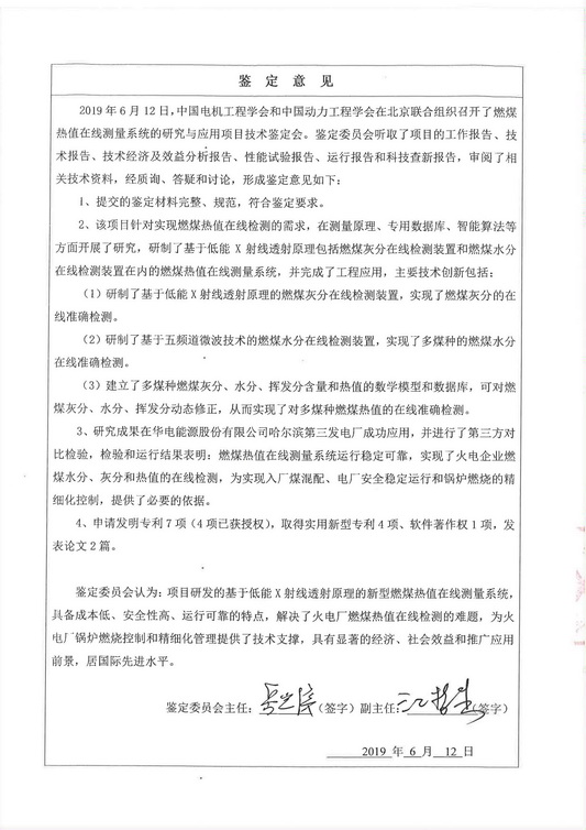 鑒定委員會認為:項目研發(fā)的基于低能X射線透射原理的新型燃煤熱值在線測量系統(tǒng),具備成本低、安全性高、運行可靠的特點,解決了火電廠燃煤熱值在線檢測的難題,為火電廠鍋爐燃燒控制和精細化管理提供了技術(shù)支撐,具有顯著的經(jīng)濟、社會效益和推廣應用前景,居國際先進水平。
